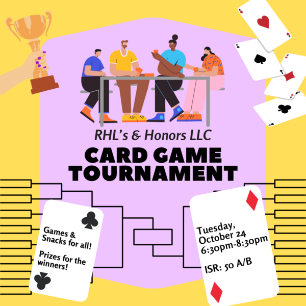 Join Res Hall Libraries and the Honors LLC for a night of card games! Bring your A-game and take on other students in cards. There will be snacks for all and, to up the ante, incentives for our winners!