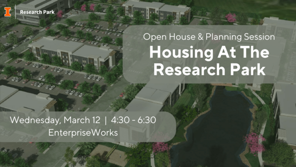 Join the University of Illinois Research Park for an open house and reception on Wednesday, March 12 from 4:30 to 6:30 p.m. to discuss the future of housing on campus at UIRP. Share your ideas and perspectives as we gather community input on residential development designed to complement the innovative ecosystem of Research Park. Enjoy a Maize taco bar and frozen margaritas (must be 21); free lot parking available.