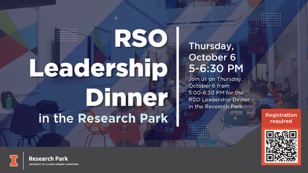 Join us on Thursday Oct. 6 from 5:00-6:30 PM for the RSO Leadership Dinner in the Research Park. Dinner will be provided and to ensure that we can provide a positive event experience with enough food and seating accommodations, we now request that you register for all Research Park events at least 24 hours in advance. Thank you for your cooperation.