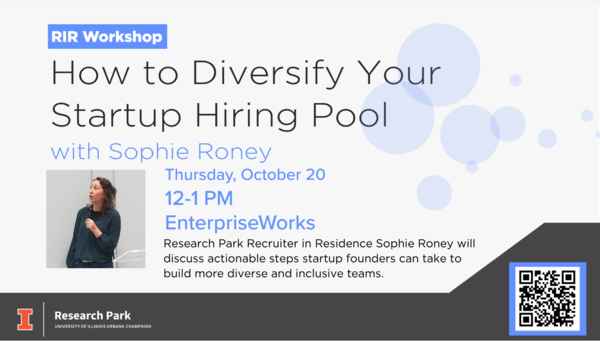 Join us on Thursday, October 20th from 12:00-1:00 PM for a Workshop with Sophie Roney on How to Diversify Your Startup Hiring Pool.