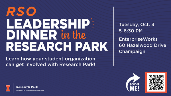 Join us on Tuesday, October 3 from 5:00-6:30 PM for the RSO Leadership Dinner in the Research Park. All student RSO leaders are invited to learn how their organization can get involved in the Research Park.