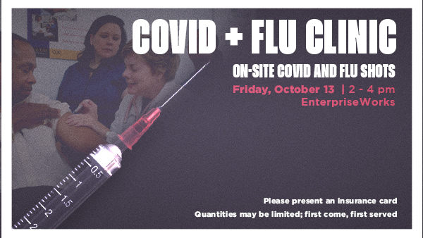 EnterpriseWorks is excited to offer our tenants an on-site COVID and Flu Shot Clinic on Friday, October 13 from 2:00 to 4:00 PM in EnterpriseWorks room 130. This is open to the entire Research Park community. Quantities may be limited, so it will be first come, first served. Please present an insurance card. No other fees will be charged.