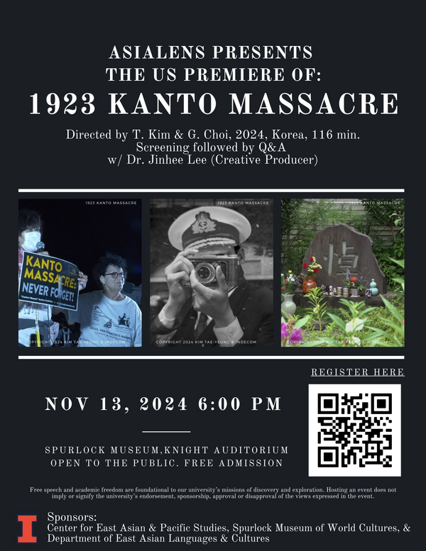 The screening will be introduced by historian and UIUC alum Dr. Jinhee Lee (Creative Producer of "1923 Kanto Massacre" and History Professor/Asian Studies Chair, Eastern Illinois University). Dr. Matt Winters, Director of CEAPS will moderate the discussion and a Q&A with the film's Creative Producer afterwards.