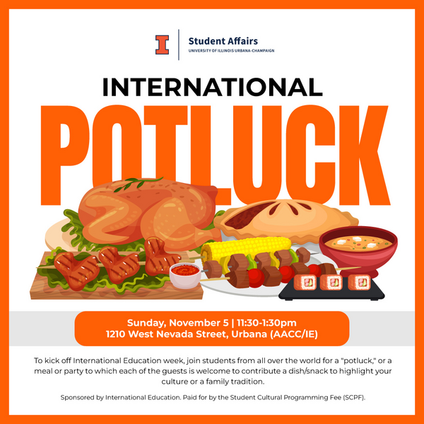 Join students from all over the world for a "potluck," or a meal or party to which each of the guests is welcome to contribute a dish. This dish can highlight your culture or a family tradition. You are not required to bring something, all are welcome to this event, which will be held at 1210 W. Nevada St in Urbana at the AACC/IE building as a way to kick off International Education Week. Please sign-up at https://forms.office.com/r/RarbitjsiK