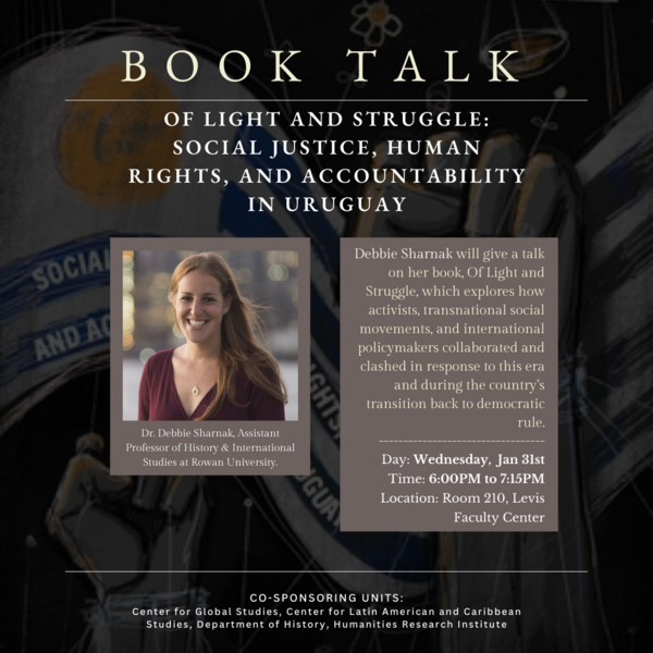 During the country’s dictatorship from 1973 to 1985, Uruguayans suffered under crushing repression, which included the highest rate of political incarceration in the world. Debbie Sharnak will give a talk on her book, Of Light and Struggle, which explores how activists, transnational social movements, and international policymakers collaborated and clashed in response to this era and during the country’s transition back to democratic rule.