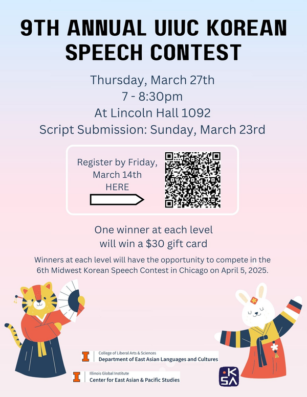 Sign up for the 9th annual UIUC Korean speech contest! There will be 3 levels to participate in and there will be 1 winner per level. Each winner will receive a $30 gift card.