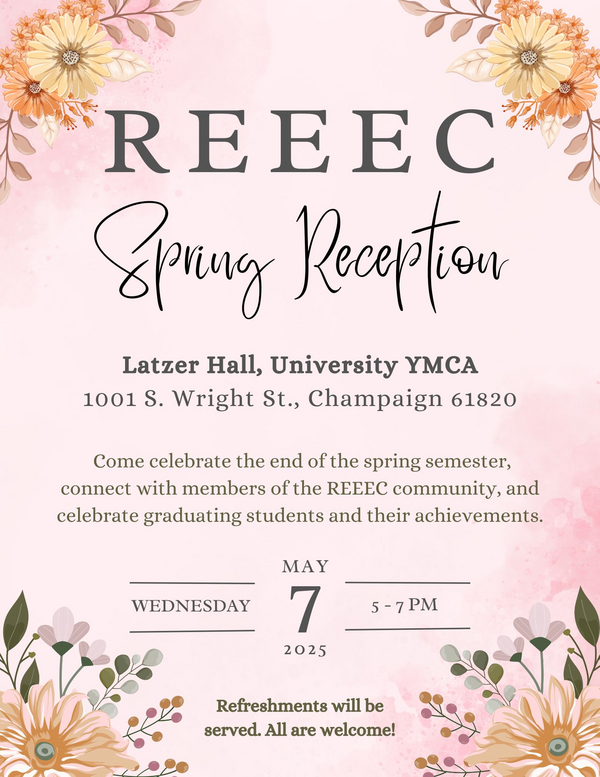 Please join us at 5:00pm on May 7th for the REEEC Spring Reception in Latzer Hall at the University YMCA. We will celebrate the end of the spring semester, connect with members of the REEEC community, and celebrate graduating students and their achievements. Refreshments will be served. All are welcome!