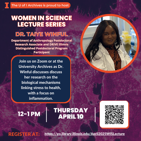 The University of Illinois Archives Women in Science Lecture Series April lecture will be given by Dr. Taiye Winful. It will be held at 12pm CDT on Thursday, April 10, 2025. Please note this lecture will be hybrid - you can either attend in person in the University Archives (room 146, Main Library) or via Zoom (a link will be emailed to you after registration).