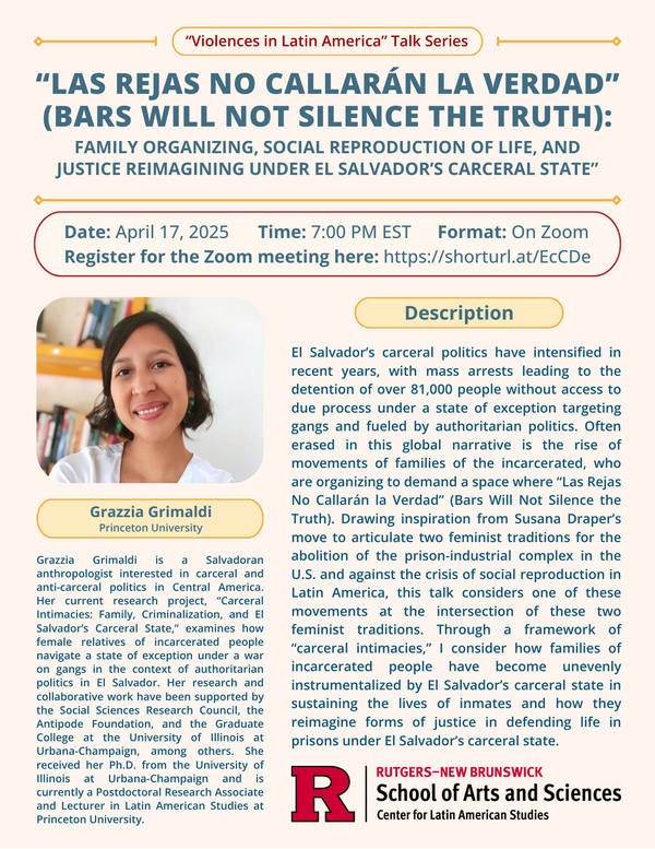 Join the Rutgers Center for Latin American Studies for their "Violences in Latin America" Talk Series featuring Illinois Anthropology alumna Dr. Grazzia Grimaldi (Princeton University) for her talk "LAS REJAS NO CALLARÁN LA VERDAD" (BARS WILL NOT SILENCE THE TRUTH): FAMILY ORGANIZING, SOCIAL REPRODUCTION OF LIFE, AND JUSTICE REIMAGINING UNDER EL SALVADOR'S CARCERAL STATE on April 17, 2025 at 7 PM EST via ZOOM.
