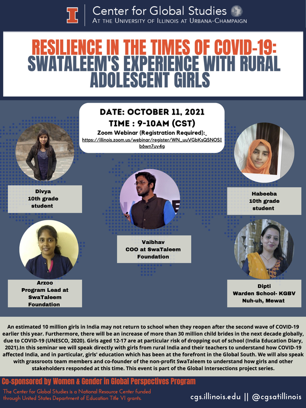 An estimated 10 million girls in India may not return to school when they reopen after the second wave of COVID-19. Furthermore, there will be an increase of more than 30 million child brides in the next decade globally, due to COVID-19 (UNESCO, 2020). Girls aged 12-17 are at particular risk of dropping out of school (India Education Diary, 2021). In this seminar, we will speak directly with girls and teachers from rural India to understand their experience with COVID-19 pandemic, and in particular, how it impacted girls' education in the Global South. We will also speak with grassroots team members and co-founder of the non-profit SwaTaleem to understand how girls and other stakeholders responded to this crisis. This event is part of the Global Intersections project series.