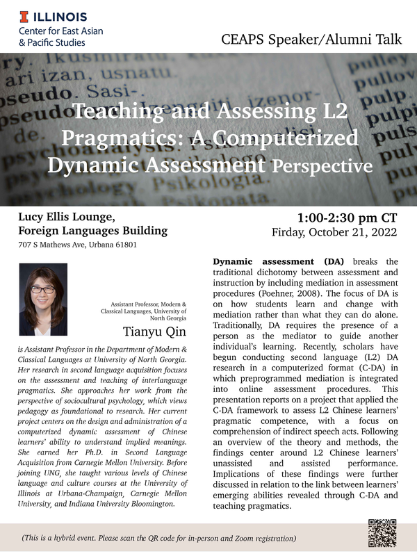 CEAPS Speaker - Tianyu Qin, “Teaching and Assessing L2 Pragmatics: A Computerized Dynamic Assessment Perspective”