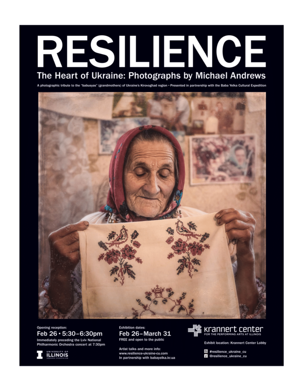Join photographer Michael Andrews of the Baba Yelka project for a closing reception honoring the “babusyas” (grandmothers) of Ukraine’s Kirovoghad region. The closing reception coincides with Krannert Center's Uncorked wine tasting event on the same evening featuring local legends Ian Shepherd & Friends (5-7pm). A cash bar will be available.