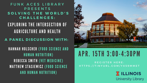 Three experts from across campus (Hannah Holscher, Food Science & Human Nutrition; Rebecca Smith, Veterinary Medicine; and Matthew Stasiewicz, Food Science & Human Nutrition) will each discuss their research connecting agriculture and health and respond to questions from attendees. Their research includes studies on connections between diet, gut microbes and health; risks to human health from pathogens originating in livestock farms; and applications of genomics and data science tools for food safety. This panel presentation will be an opportunity for people to come together with the Funk ACES Library to learn about and discuss research exploring the intersection of agriculture and health.