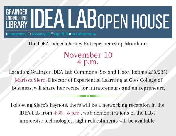 IDEA Lab celebrates Entrepreneurship Month on Nov 10th. Marissa Siero, Director of Experiential Learning at Gies College of Business, will share her personal recipe for intrapreneurs and entrepreneurs alike. Following the keynote, join us for a reception in the IDEA Lab, learn about our services and discover the campus ecosystem supporting innovation. Light snacks & refreshments will be available.