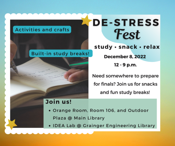 We invite you to join us in the Main Library on Thursday, 12/8 for a study break anytime between 12-9 pm for our end-of-the-semester tradition, De-Stress Fest! No matter your preferred method of stress relief, there’s a study break activity for everyone. From calming crafts, care packages, meditation, and academic support, to tactile and cathartic de-stressing and donuts, take a moment to relax and return to your studying refreshed, supported, and refocused. Below is a list of our events for the day. Studying at Grainger? Check out their De-Stress Fest activities here https://uiuc.libcal.com/calendar/enx/destressidea: