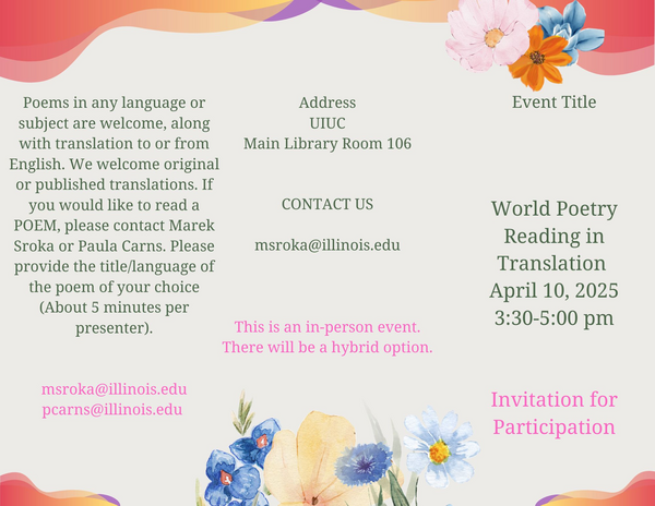 Poems in any language or subject are welcome, along with translation to or from English. We welcome original or published translations. If you would like to read a poem, please contact Marek Sroka or Paula Carns. Please provide the title/language of the poem of your choice (about 5 minutes per presenter).