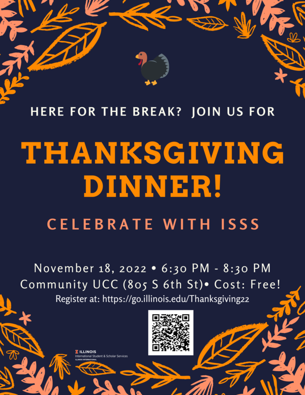 ISSS invites you to share Thanksgiving Dinner with us on Friday, November 18th from 6:30-8:30pm and the Community United Church of Christ (805 S 6th St, Champaign). This event is completely free! Please register at go.illinois.edu/Thanksgiving22. Space is limited, so register today!