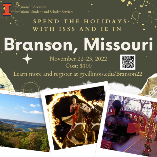 Staying on campus over Fall Break? Get away with ISSS and IE! We will be taking a 2 day trip to Branson, Missouri on November 22-23rd! We'll learn about the local area at Table Rock State Park, eat a four-course meal and watch a horse show at Dolly Parton's Stampede, visit Silver Dollar City, and more! Cost of the trip is $100. Register at go.illinois.edu/Branson22. Space is limited, so don't wait to register!