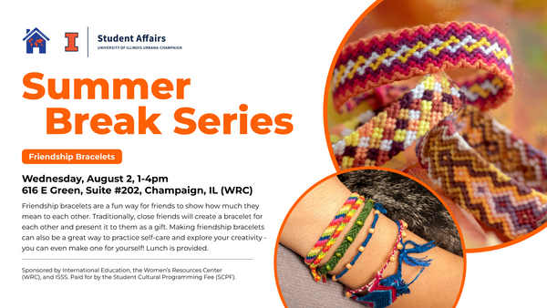 Friendship bracelets are a fun way for friends to show how much they mean to each other. Traditionally, close friends will create a bracelet for each other and present it to them as a gift. Making friendship bracelets can also be a great way to practice self-care and explore your creativity - you can even make one for yourself! Lunch is provided. Sponsored by ISSS, International Education, and the Women’s Resources Center.