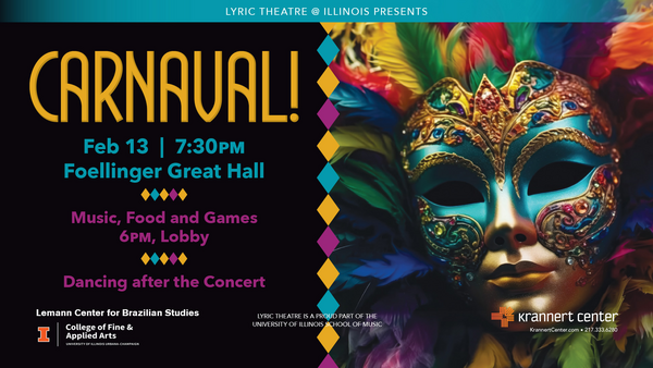The party will start at 6 pm in the Krannert Center lobby, followed by a concert at 7:30 pm and live samba dancing and drinks from 9 to 11 pm. At 6:30 pm, for the lively tunes of a Brazilian Group playing Marchinhas de Carnaval.