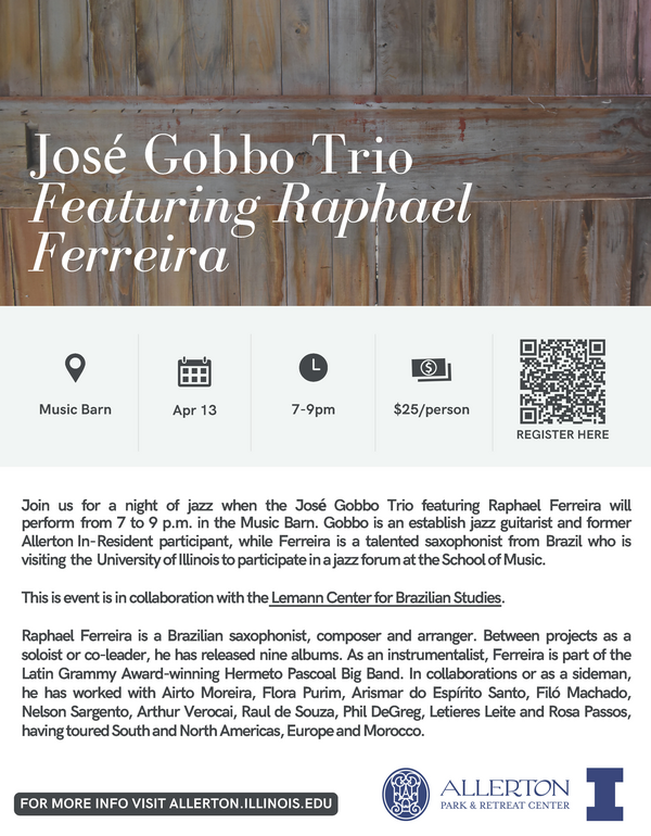 Join us for a night of jazz when the José Gobbo Trio featuring Raphael Ferreira will perform from 7 to 9 p.m. in the Music Barn. Gobbo is an establish jazz guitarist and former Allerton In-Resident participant, while Ferreira is a talented saxophonist from Brazil who is visiting the University of Illinois to participate in a jazz forum at the School of Music.