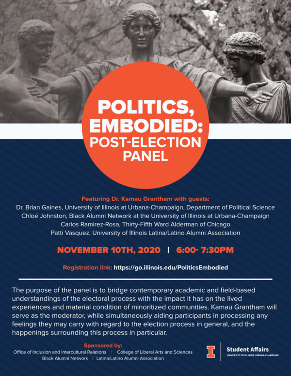 The purpose of the panel is to bridge contemporary academic and field-based understandings of the electoral process with the impact it has on the lived experiences and material condition of minoritized communities. Kamau Grantham will serve as the moderator, while simultaneously aiding participants in processing any feelings they may carry with regard to the election process in general, and the happenings surrounding this process in particular.
