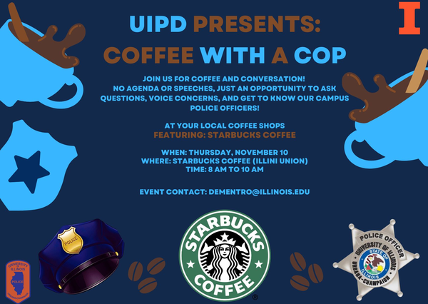 No agenda or speeches, just an opportunity to ask questions, voice concerns, and get to know our campus police officers!