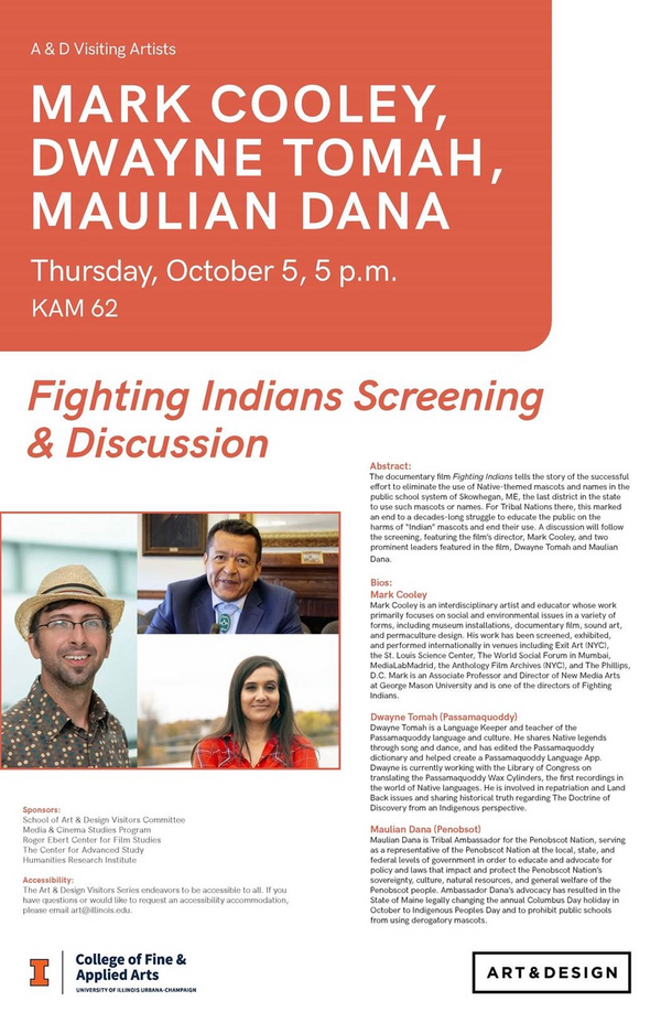 The documentary film Fighting Indians tells the story of the successful effort to eliminate the use of Native-themed mascots and names in the public school system of Skowhegan, ME, the last district in the state to use such mascots or names. For Tribal Nations there, this marked an end to a decades-long struggle to educate the public on the harms of “Indian” mascots and end their use. A talk-back will follow the screening, featuring Mark Cooley (the film's director), Dwayne Tomah (Passamaquoddy Language Keeper and teacher), and Maulian Dana (Tribal Ambassador for the Penobscot Language).