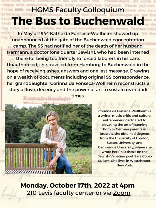 In 1944 Käthe da Fonseca-Wollheim showed up at the gate of Buchenwald. The SS had notified her of the death of her husband Hermann. Unauthorized, she traveled to Buchenwald in the hope of receiving ashes, answers and one last message. Drawing on documents including original SS correspondence, her granddaughter Corinna da Fonseca-Wollheim reconstructs a story of love, decency and the power of art to sustain us in dark times.