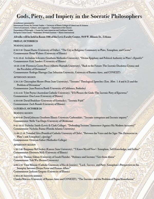 In keeping with the general tendency of contemporary scholarship, the most prominent works on “Socratic” theology to date are really works on the theology of Socrates as it is represented in Plato’s writings. This conference aims to provide a welcome and needed corrective to Socratic studies regarding the gods and/or related issues of piety and impiety by featuring papers that engage with the works of Xenophon, Antisthenes, and other so-called “Minor Socratics,” in addition to the dialogues of Plato. In addition to an invited keynote by Prof. Claudia Mársico, one of Latin America’s leading scholars of ancient philosophy, the conference will feature 12 papers (selected through a blind review of abstracts) spread out over two days.