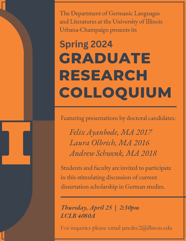 The graduate students of the Department of Germanic Languages and Literatures are pleased to announce their research colloquium for the spring of 2024. On April 25, doctoral candidates Felix Ayanbode, Laura Olbrich, and Andrew Schwenk will speak on the most current work in their ongoing dissertation research. Please join us for a short series of informative presentations on German studies scholarship followed by a discussion period.