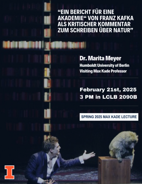 Visiting Max Kade Professor, Marita Meyer, will present “Ein Bericht für eine Akademie“ von Franz Kafka als kritischer Kommentar zum Schreiben über Natur”.