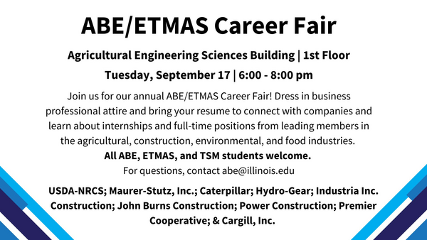 Join us for our annual ABE/ETMAS Career Fair! Dress in business professional attire and bring your resume to connect with companies and learn about internships and full-time positions from leading members in the agricultural, construction, environmental, and food industries. All ABE, ETMAS, and TSM students welcome.