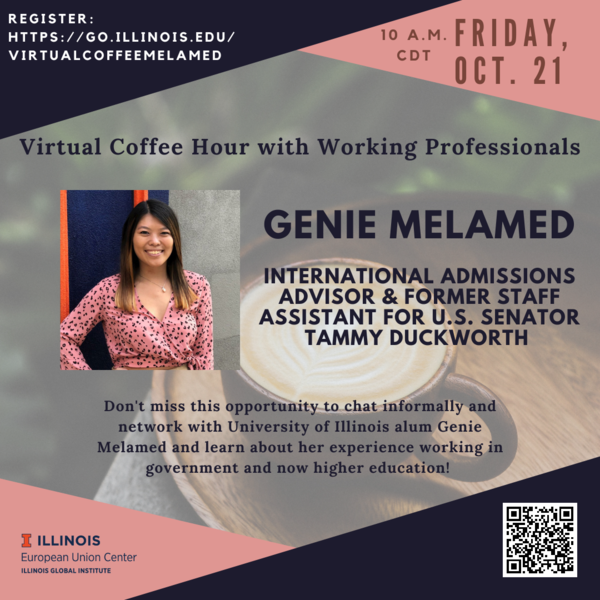 Are you curious about what’s it like to work on the administrative side of higher education and/or government? If so, come to this virtual coffee hour with University of Illinois alum Genie Melamed, International Admissions Advisor at Illinois Institute of Technology and former Staff Assistant in the Office of U.S. Senator Tammy Duckworth. Genie will discuss her career trajectory and share her experience transitioning from government work to higher education. Register at https://go.illinois.edu/VirtualCoffeeMelamed.