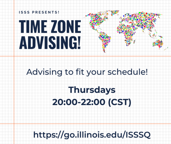 Times have changed but times zones have not! ISSS is now offering Time Zone Advising sessions on Thursdays from 20:00-22:00 (CST) for students who are unable to meet with us during our regular business hours.