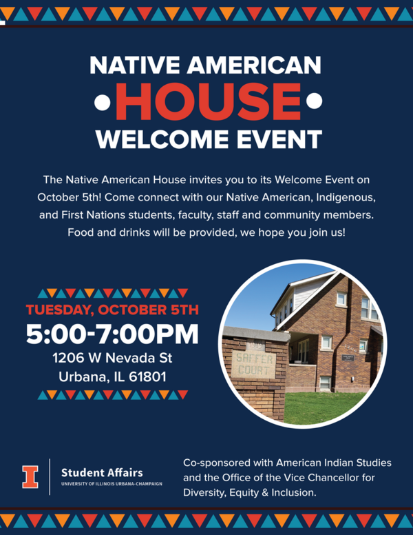 The Native American House invites you to its Welcome Event on October 5th! Come connect with our Native American, Indigenous, and First Nations students, faculty, staff and community members. Food and drinks will be provided, we hope you join us!