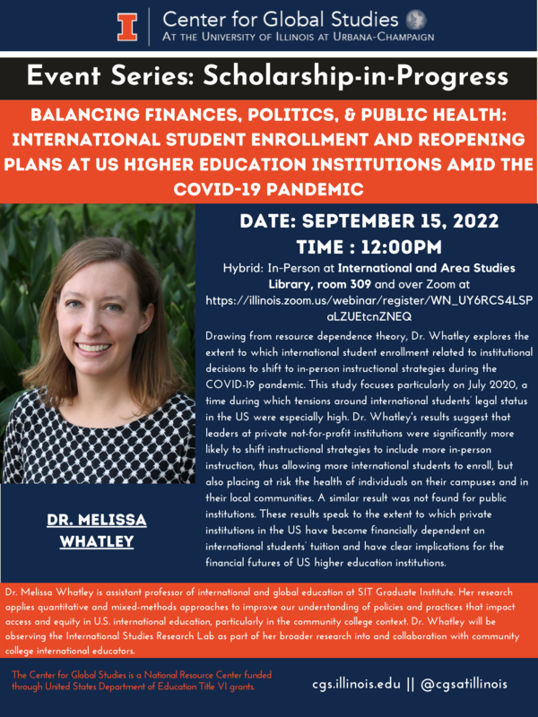 On September 15th, at 12PM (CST), Dr. Melissa Whatley will be speaking in-person at the International and Area Studies Library 309 and on Zoom.
