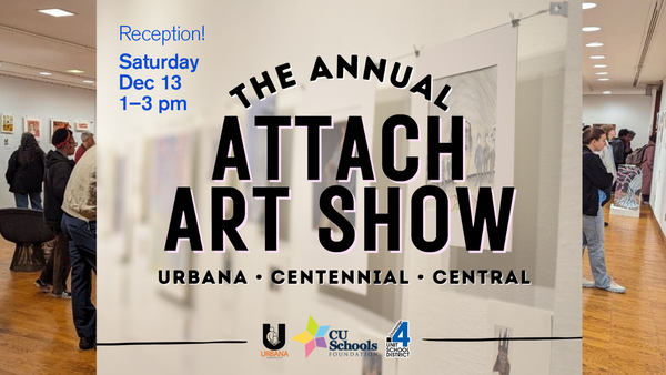 Join us for ATTACH ART SHOW highlighting artwork by area art students from Urbana, Central, and Centennial High Schools. The show will feature artwork inspired by artwork from the Krannert Art Museum. This art show is a collaboration between Champaign Unit 4 School District, Urbana School District 116, Champaign Urbana Schools Foundation, and Krannert Art Museum, generously funded by a CU Schools Grant supported by The Volk Family.