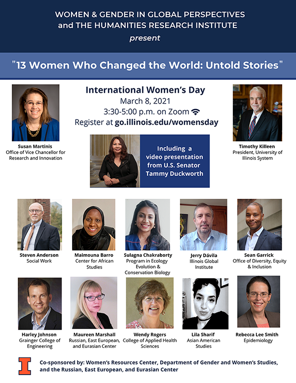 The Women and Gender in Global Perspectives Program and the Humanities Research Institute and co-host this annual event bringing together faculty, staff, students, and community members to recognize people who have made a difference in academia. Each speaker will have five minutes to tell the story of a woman in their discipline that changed the field in important ways. See more information and an updated speaker list.