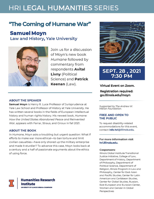 In Humane, Moyn asks a troubling but urgent question: What if efforts to make war more ethical—to ban torture and limit civilian casualties—have only shored up the military enterprise and made it sturdier? To advance this case, Moyn looks back at a century and a half of passionate arguments about the ethics of using force.Cosponsors include: Illinois Global Institute Transitional Justice Initiative, College of Law, Department of History, Department of Philosophy, Department of Political Science, Department of Religion, Illinois Program in Law and Philosophy, Center for East Asian and Pacific Studies, Center for Latin American and Caribbean Studies, Center for Global Studies, Russian, East European and Eurasian Center, Women and Gender in Global Perspectives.