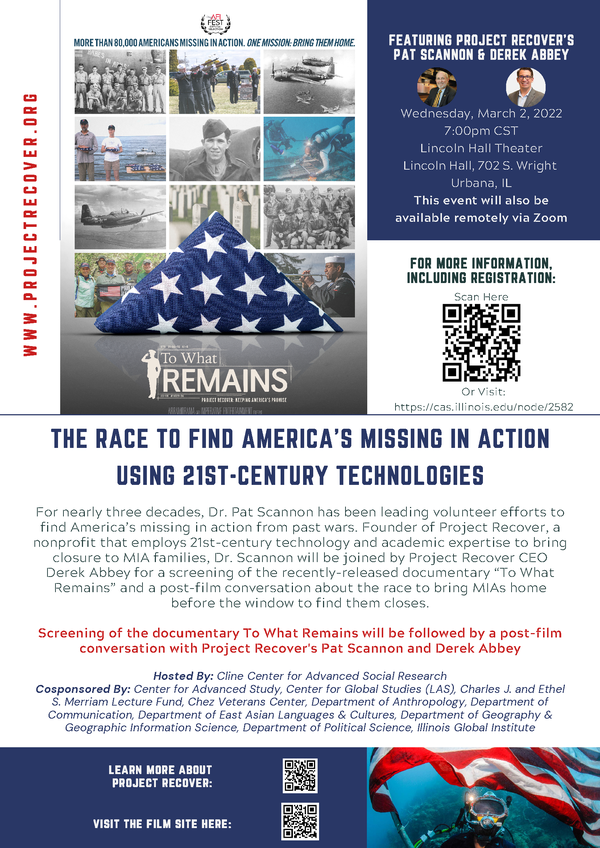 For nearly three decades, Dr. Pat Scannon has been leading volunteer efforts to find America’s missing in action from past wars. Founder of Project Recover, a nonprofit that employs 21st-century technology and academic expertise to bring closure to MIA families, Dr. Scannon will be joined by Project Recover CEO Derek Abbey for a screening of the recently-released documentary “To What Remains” and a post-film conversation about the race to bring MIAs home before the window to find them closes.