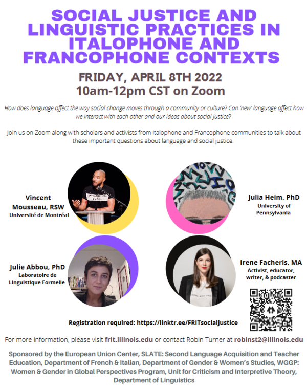 Sponsored by the European Union Center, SLATE: Second Language Acquisition and TeacherEducation, Department of French & Italian, Department of Gender & Women’s Studies, WGGP:Women & Gender in Global Perspectives Program, Unit for Criticism and Interpretive Theory, and Department of Linguistics.