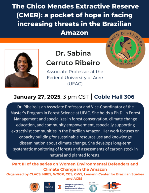 Sabina Cerruto Ribeiro, Associate Professor in Forest Science at the Federal University of Acre, wilI deliver the latest talk in the 2024-25 series, "Women Environmental Defenders and Climate Change in the Amazon." The year-long series is sponsored by the Center for Latin American and Caribbean Studies (CLACS), Department of Natural Resources and Environmental Sciences (NRES), Women and Gender in Global Perspectives Program (WGGP), Gender and Women's Studies (GWS), the Lemann Center for Brazilian Studies, and the College of Agricultural, Consumer and Environmental Sciences (ACES).