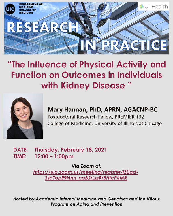 Dr. Mary Hannan is presenting for the Division of Academic Internal Medicine and Geriatrics (AIM) and the Vitoux Program on Aging and Prevention, Department of Medicine’s “Research in Practice” seminar talks: "The Influence of Physical Activity and Function on Outcomes in Individuals with Kidney Disease "