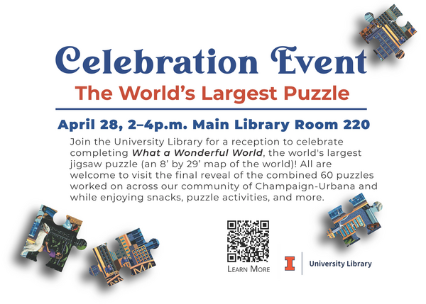 The U of I and CU community completed the World's Largest Puzzle, "What a Wonderful World," in fall 2023-spring 2024. This 60 section, 6,000 piece puzzle depicts a detailed map of the world, and in total is 8' high x 29' wide. It will be hung in the hallway outside room 220 (the Scholarly Commons) in the Main Library for the event. Remarks will start at 2, and after attendees are welcome to view the puzzle, participate in a puzzle swap, and play puzzle activities.