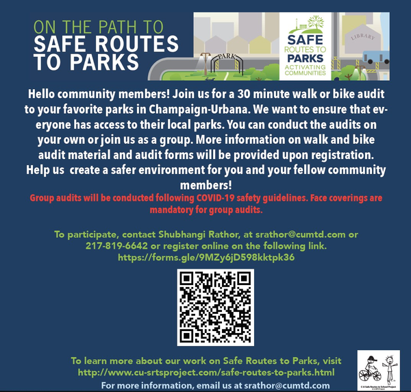 To learn more about our work on Safe Routes to Parks, visit http://www.cu-srtsproject.com/safe-routes-to-parks.html. Champaign-Urbana Safe Routes to School Project. For more information, email us at srathor@cumtd.com