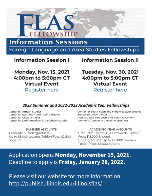 Undergraduate and graduate students are invited to this information session to learn more about the Foreign Language & Area Studies (FLAS) fellowship. Topics of discussion include eligibility and requirements, walking through the application, and answering questions about the application process and the fellowship. FLAS coordinators from individual centers will be in attendance and available to the students for questions and discussion in break-out sessions after the main presentation. Register for the info session here.