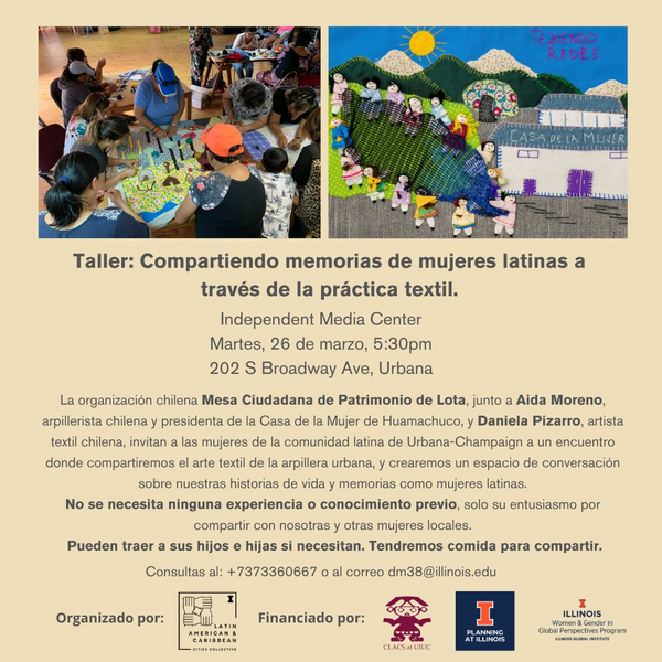 La organización chilena Mesa Ciudadana de Patrimonio de Lota, junto a Aida Moreno, arpillerista chilena y presidenta de la Casa de la Mujer de Huamachuco, y Daniela Pizarro, artista textil chilena, invitan a las mujeres de la comunidad latina de Urbana-Champaign a un encuentro donde compartiremos el arte textil de la arpillera urbana, y crearemos un espacio de conversación sobre nuestras historias de vida y memorias como mujeres latinas.