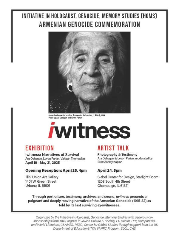 The Initiative in Holocaust, Genocide, Memory Studies’ Annual Armenian Remembrance Event. We are thrilled that this year’s visitors are Ara Oshagan and Levon Parian, the brilliant photographers behind the moving iWitness project which has brought stunning images of survivors of the Armenian genocide to many sites as large scale installations and smaller, more intimate connections. HGMS has organized two exhibits and a talk: several large images will be on view after March 5th at the Siebel center for design. From April 10-May 31 an exhibit of smaller images and remembrances will be on display at the beautiful Art Gallery inside the Illini Union. On April 24th at 5pm, Oshagan and Parian will be in conversation (moderated by HGMS director Brett Ashley Kaplan) at the Starlight Room of the Siebel Center. On April 25th at 4pm there will be a reception at the Illini Union Art Gallery.