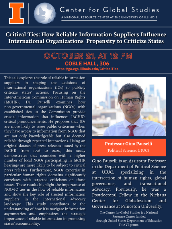 Professor Gino Pauselli (Political Science, UIUC), "Critical Ties: How Reliable Information Suppliers Influence International Organizations' Propensity to Criticize States"